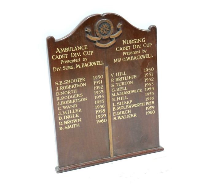 The St Johns ambulance crest is carved to the top and it is finished with lovely handwritten lettering which contrasts the colour of the wood well.